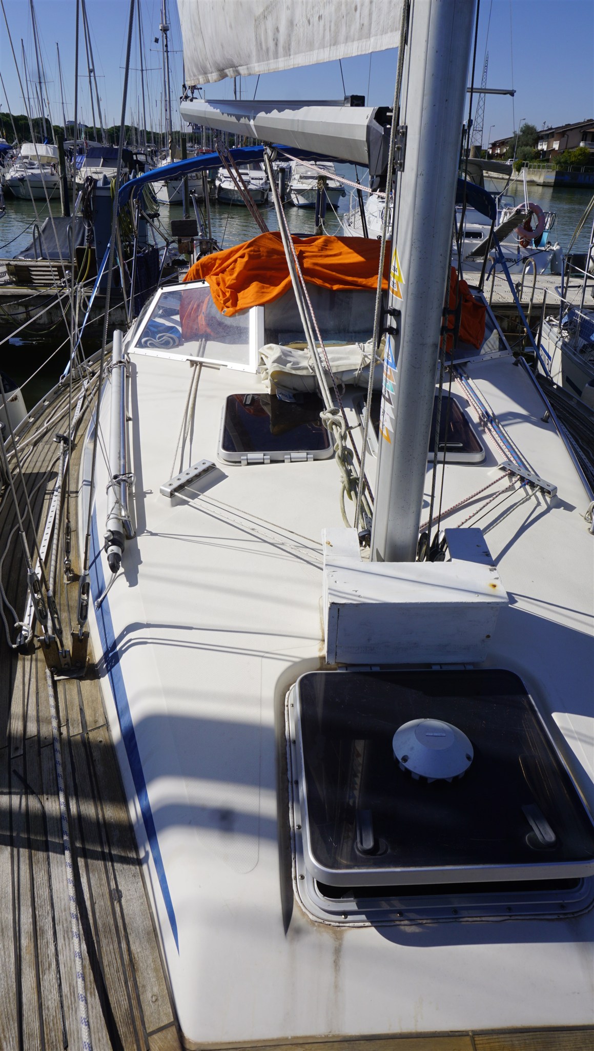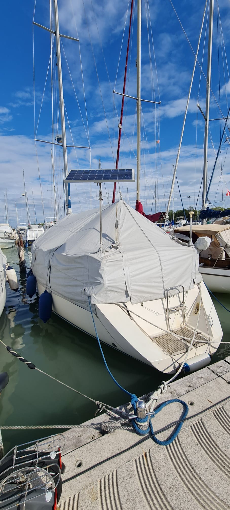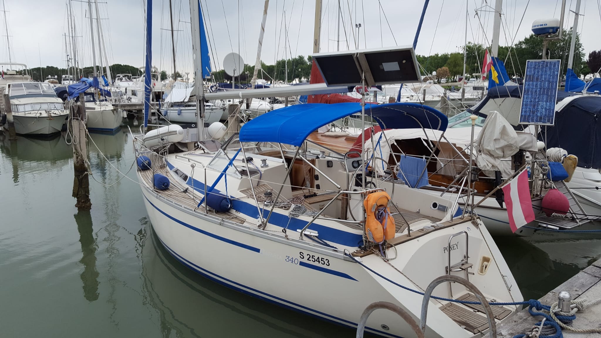 Anker, Badeleiter, Batterieladegerät (DOMETIC), Batterien, Beiboot, Cockpitdusche, elektrische Ankerwinde, elektrische Bilgepumpe, Fender, Gangway, Kran für Tender, Landanschluß, manuelle Bilgepumpe, Plattform, Windex.