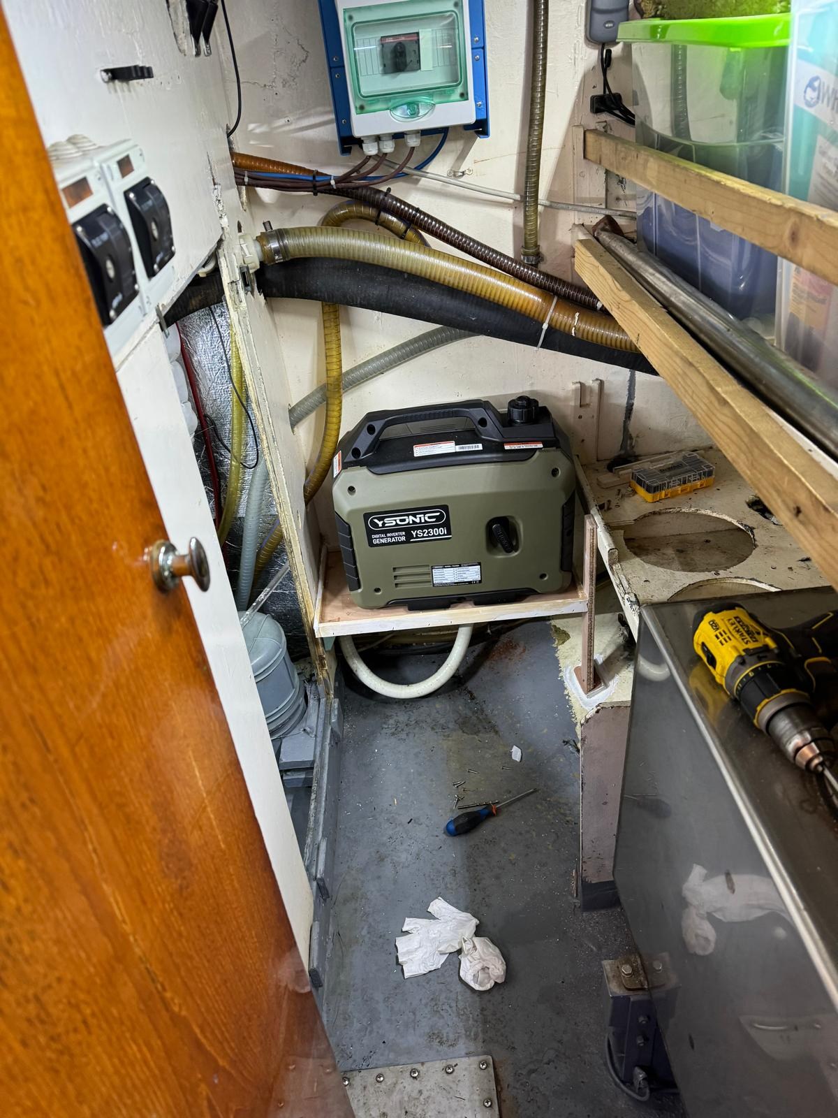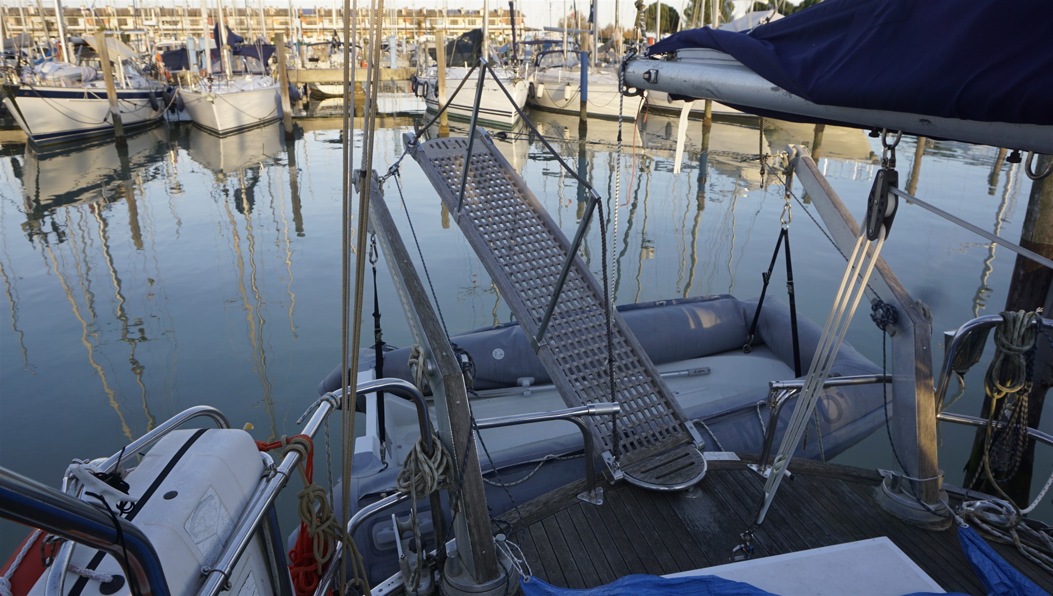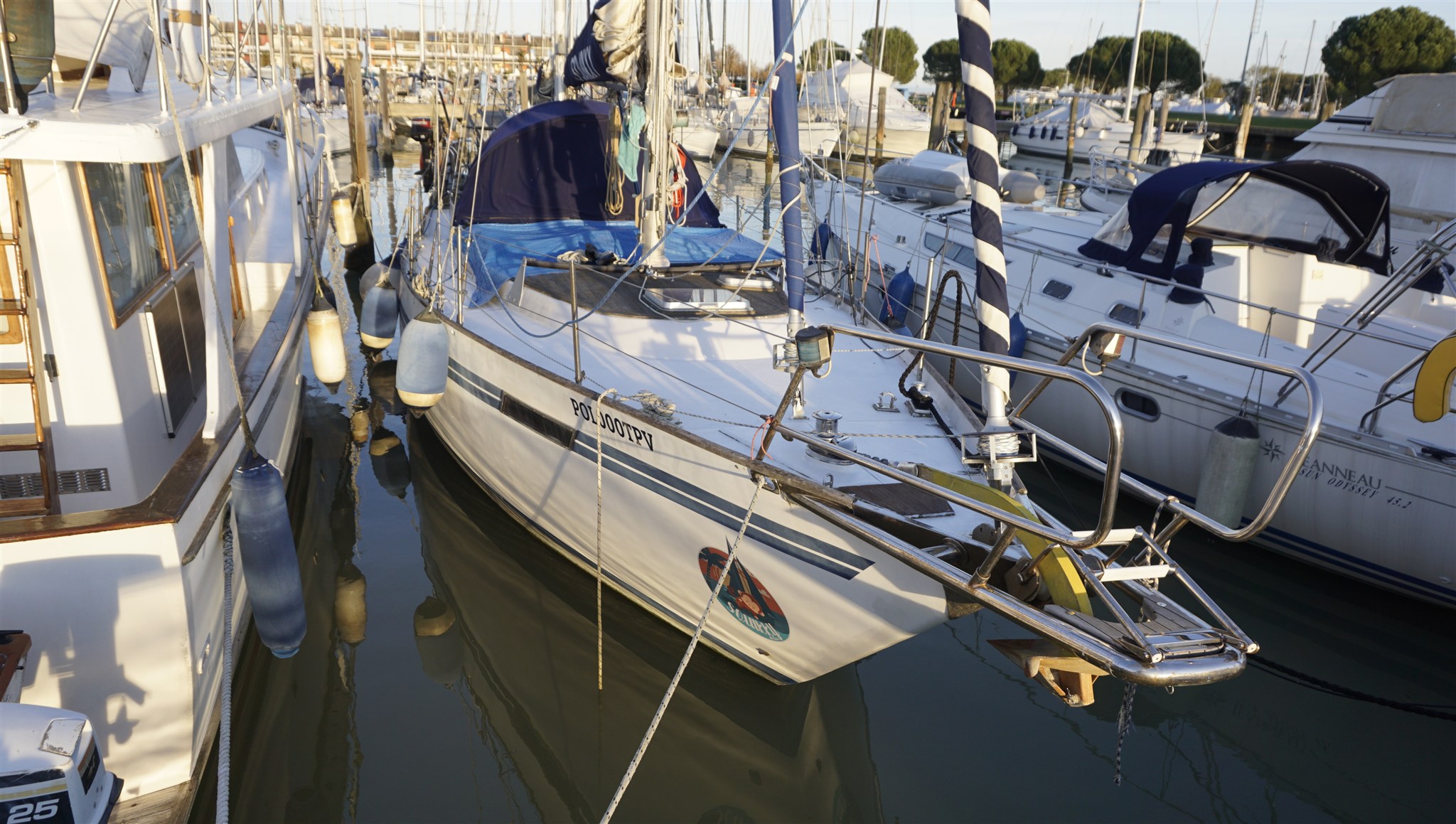 Anker (70 kg + 120 m 12mm chain), Außenbordmotor für Beiboot (TOHATSU 9.9), Badeleiter (+ bow ladder), Batterieladegerät, Batterien (2024/25), Beiboot (RIB), Bugstrahlruder (rev. 2024), Cockpitdusche, Cockpittisch, Druckwasserpumpe, elektrische Ankerwinde, elektrische Bilgepumpe, Fender, Gangway, Kran für Außenborder, Landanschluß, manuelle Bilgepumpe, Plattform, Solarpanel, Wechselstromgenerator (new), Windex, Windgenerator, Winschen, Winschen elektrish (2 x ).