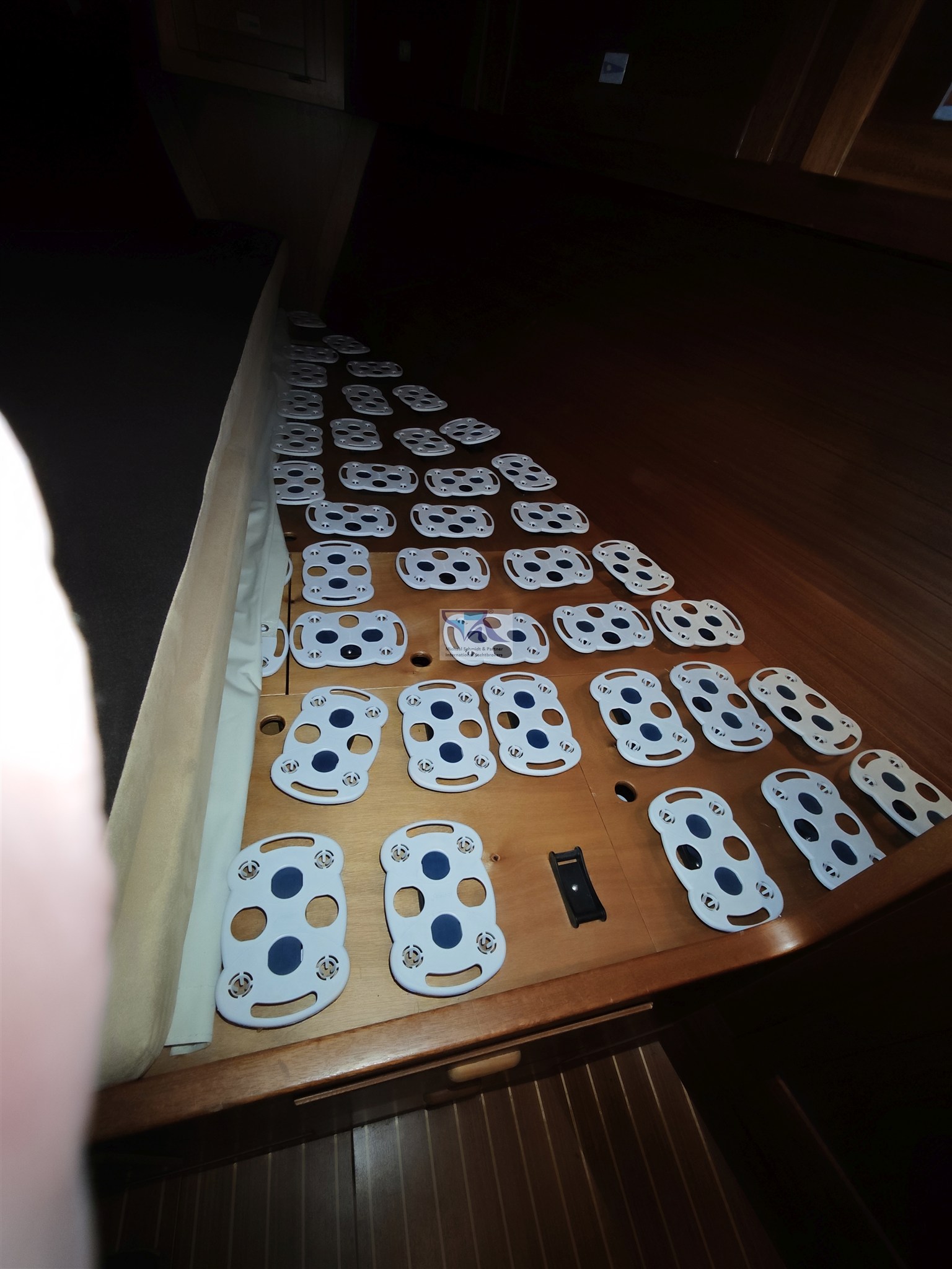 Anker, automatische Bilgepumpe, Badeleiter, Batterieladegerät (Philippi), Batteriemonitor (Philippi), 3 x Batterien, Bugstrahlruder (einziehbar), elektrische Ankerwinde, Landanschluß, manuelle Bilgepumpe, Solarpanel, Windex, 2 x Winschen (Andersen 28 ST), 4 x Winschen elektrish (Andersen 46 ST und 40 ST).