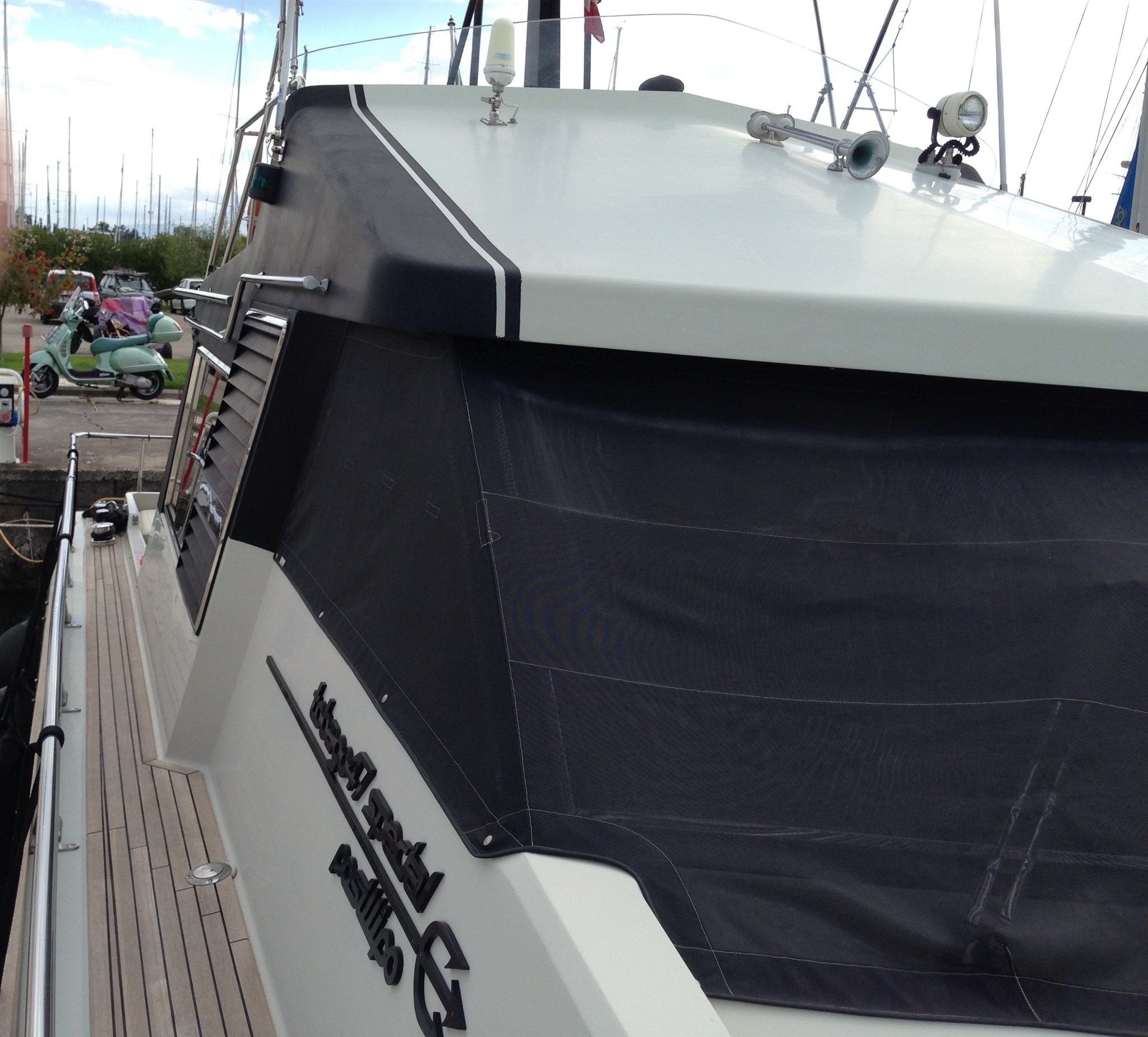Bimini, Bugpolster, Cockpitpersenning, Cockpitpolster, Flybridge Cover, Instrumenten Abdeckung, Matratzen, Persenning für Fenster, Sonnenpersenning, Sonnenpolster auf Flybridge.